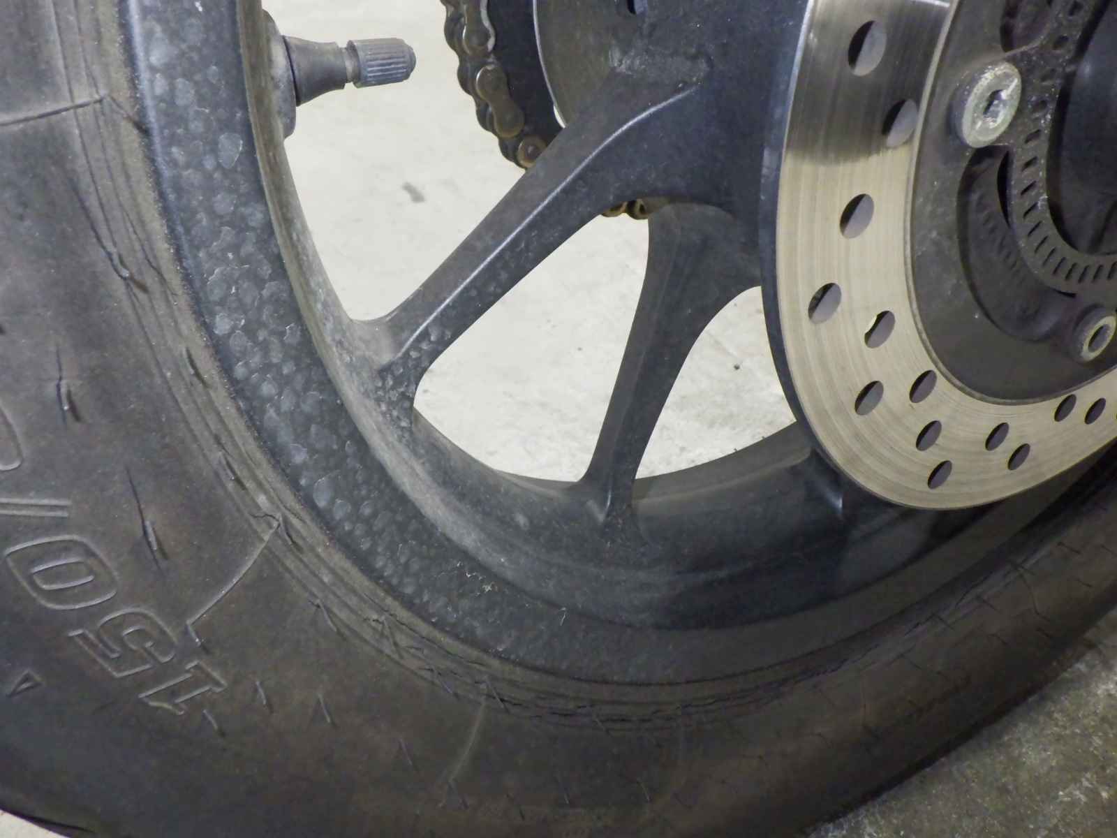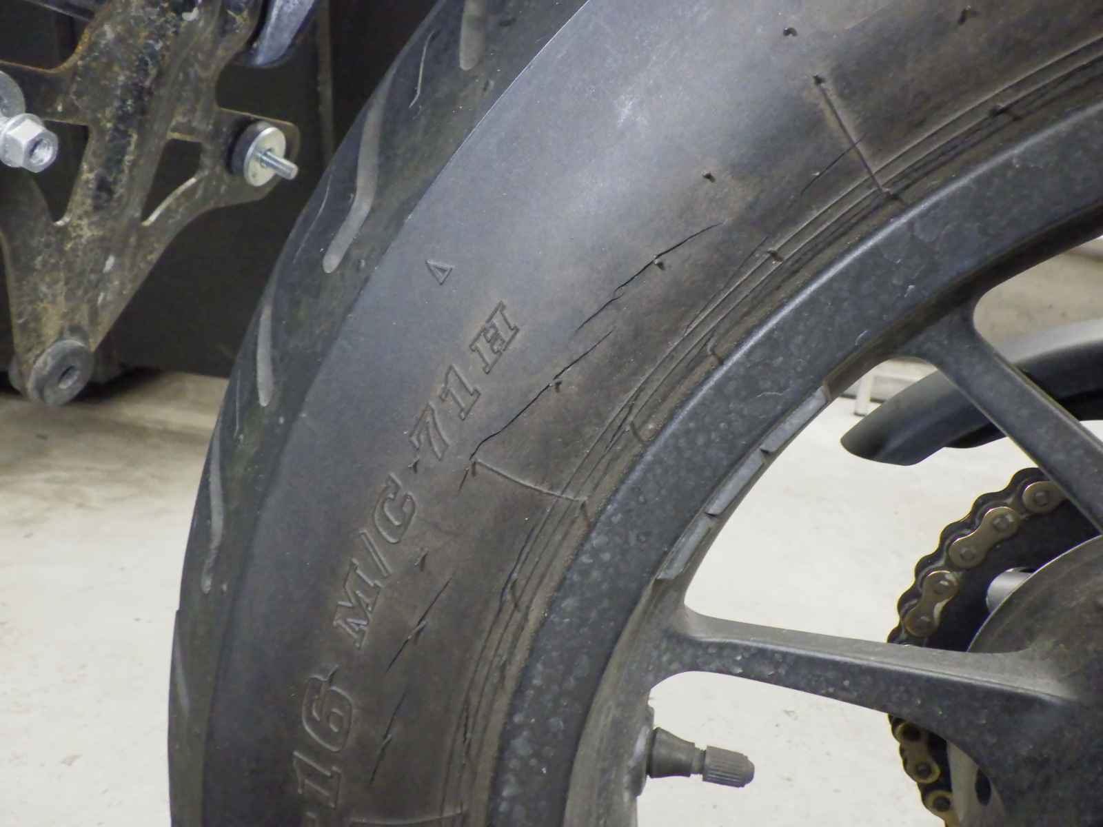 Задняя покрышка: Трещина на шине, требуется замена.