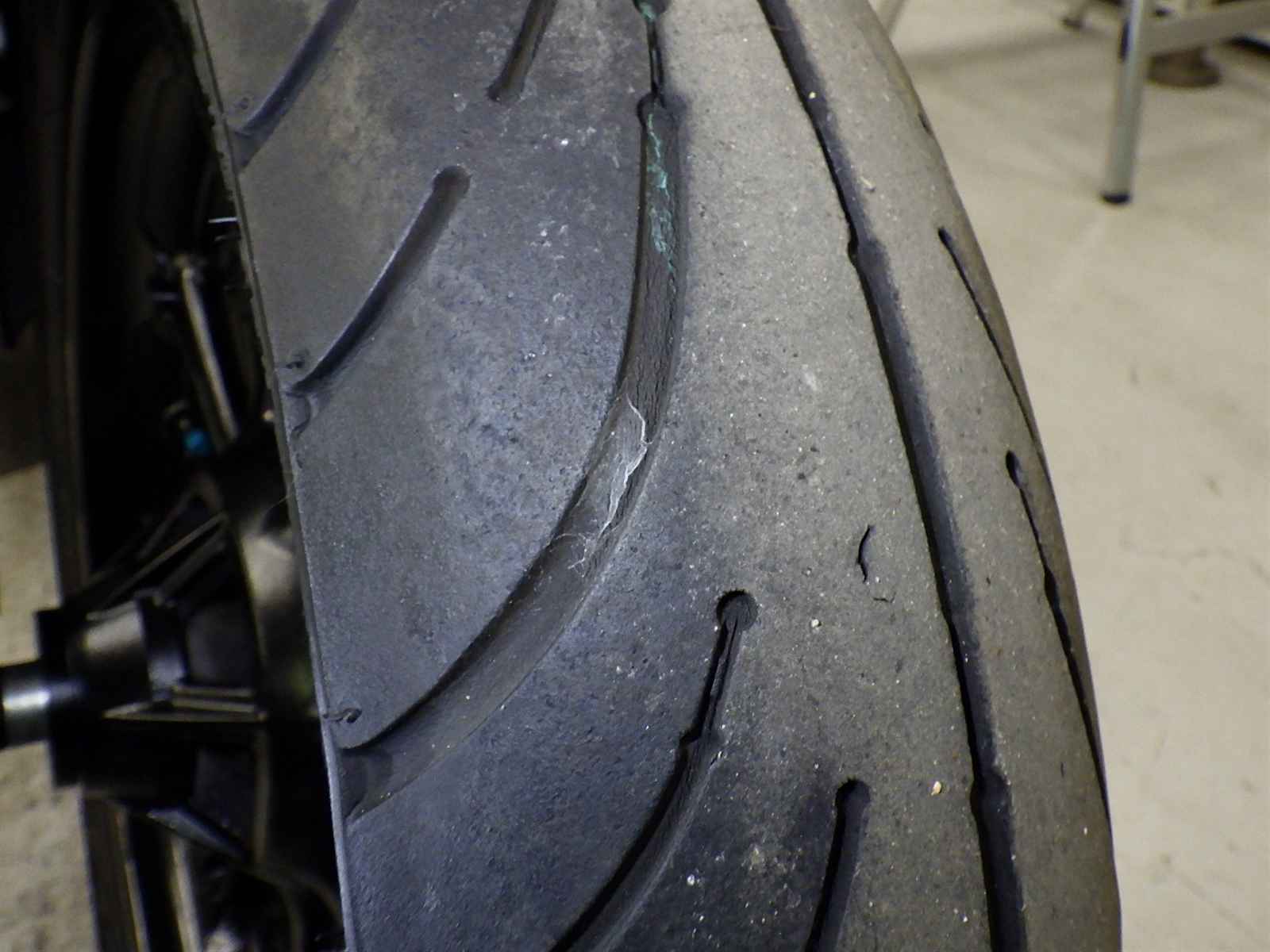 Передняя покрышка: Трещина на шине, требуется замена.