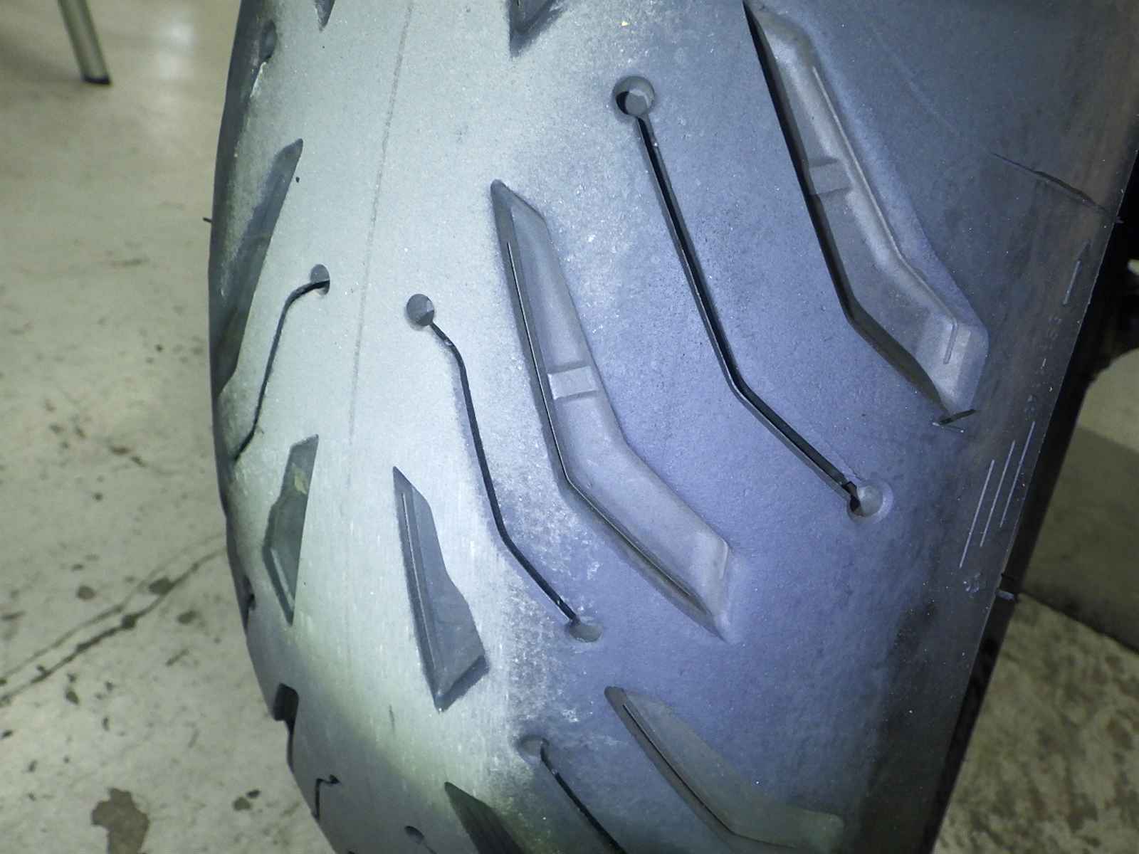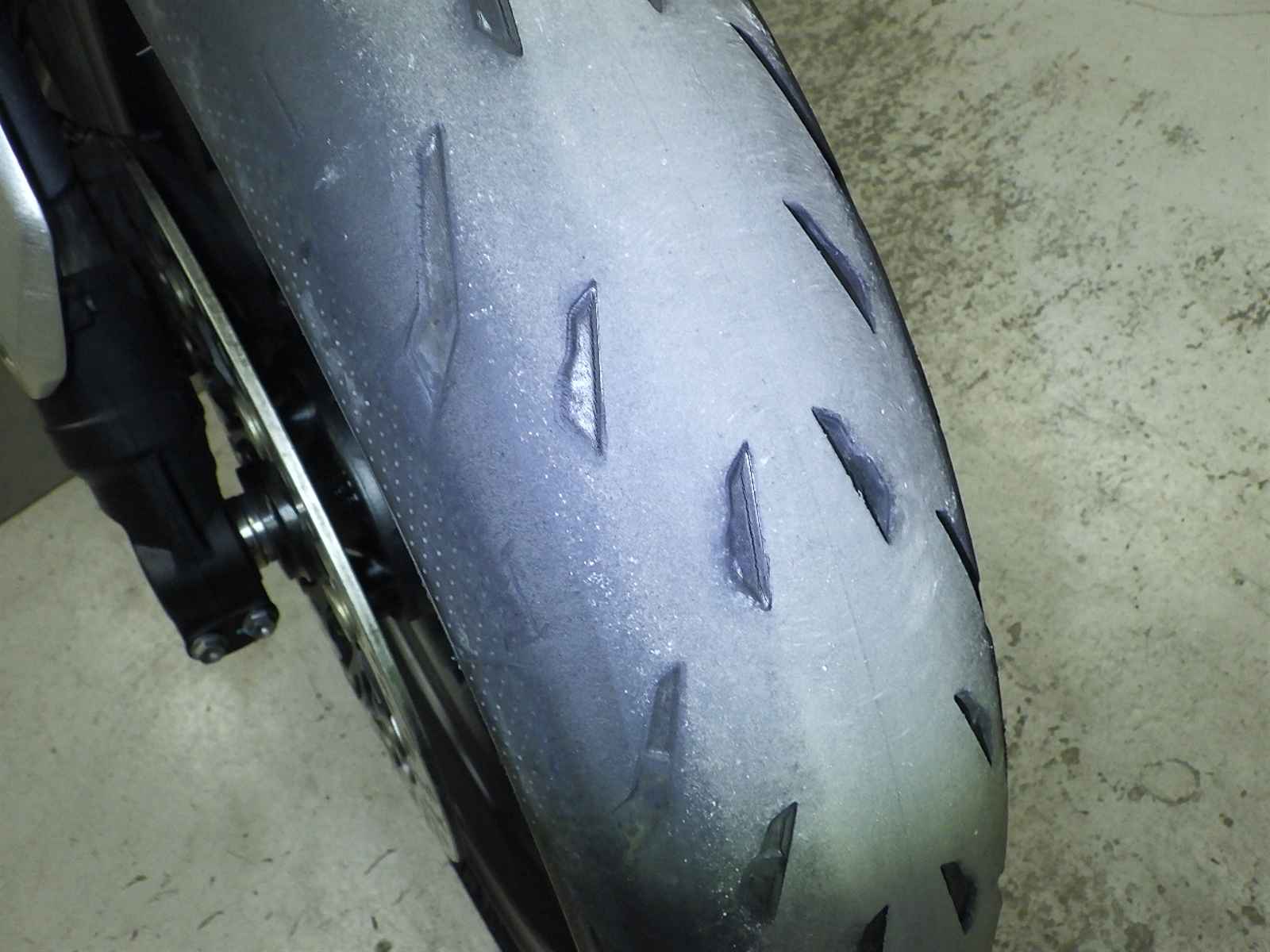 Передняя покрышка: Снижение давления в шине, Трещина требует замены.