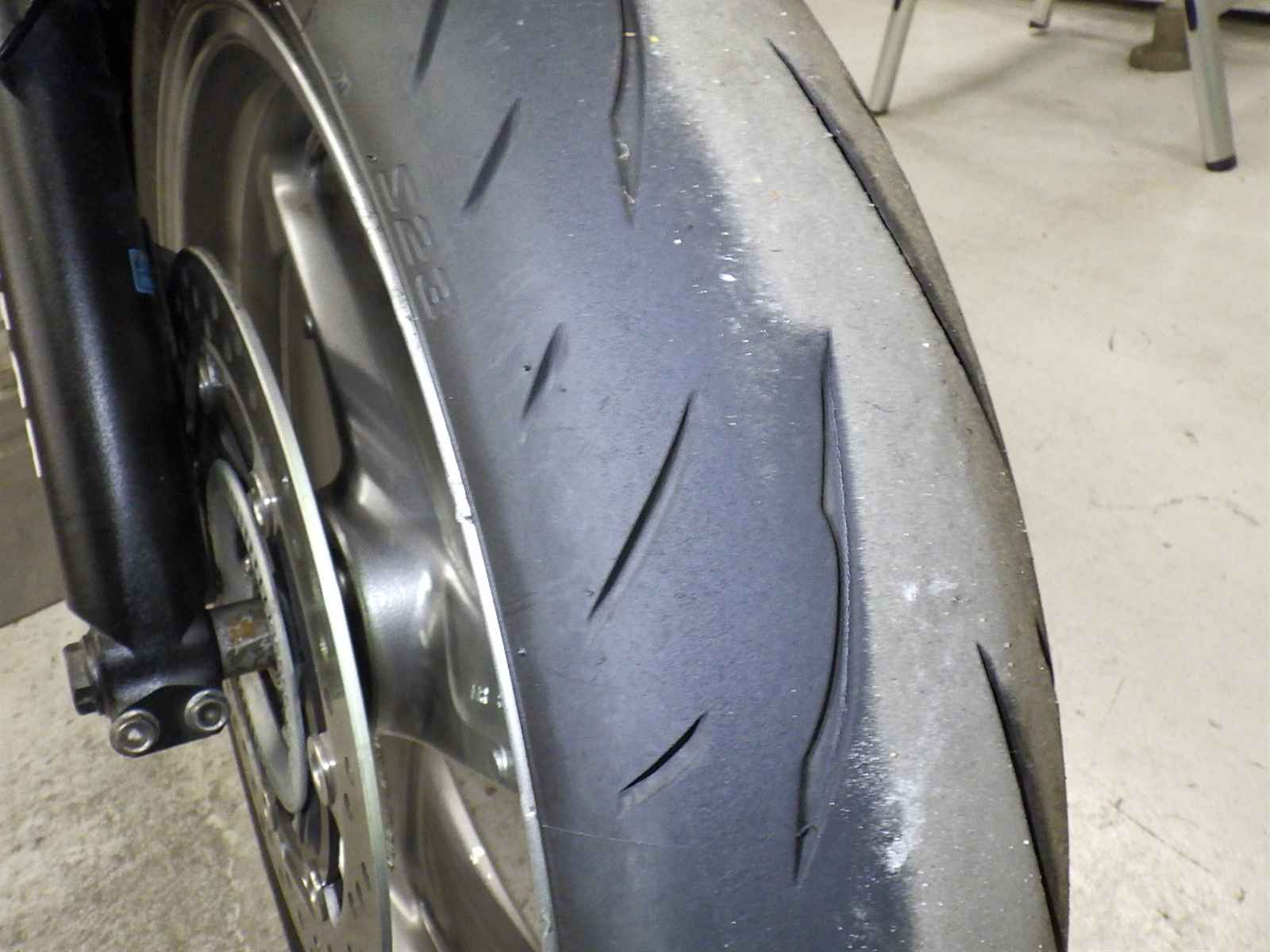 Передняя покрышка: Снижение давления в шине, Трещина требует замены.