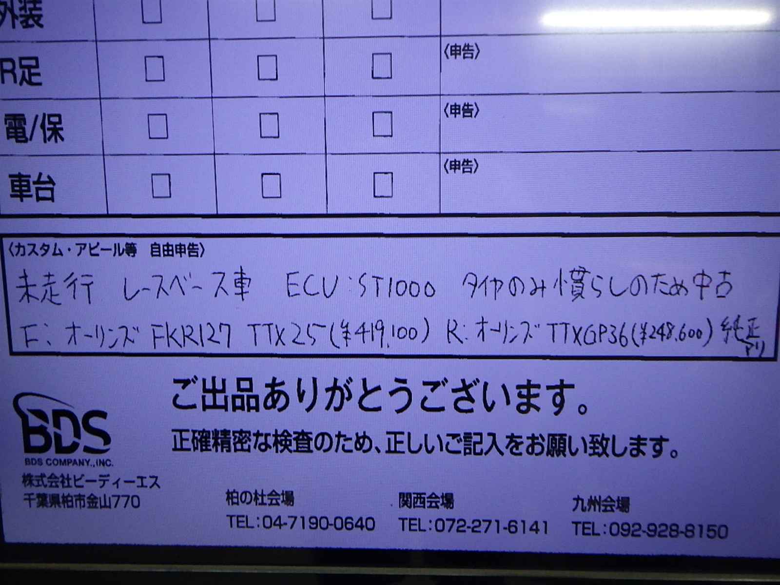 未走行、レースベース車。申告撮影済み。ショック、ステップ他有。