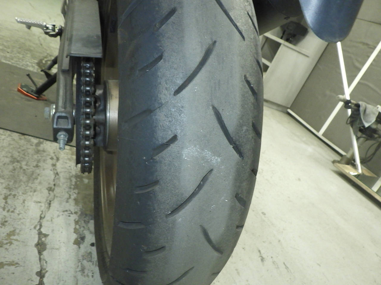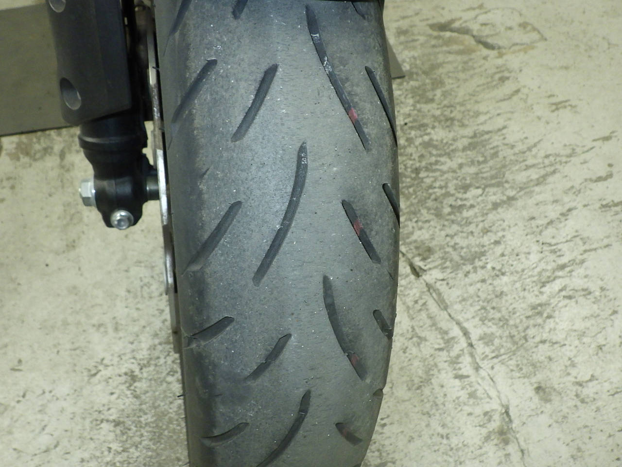 Передняя покрышка: Снижение давления в шине, Трещина требует замены.