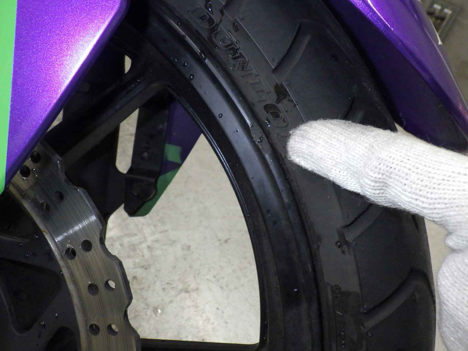Передняя покрышка: Снижение давления в шине, Трещина требует замены.