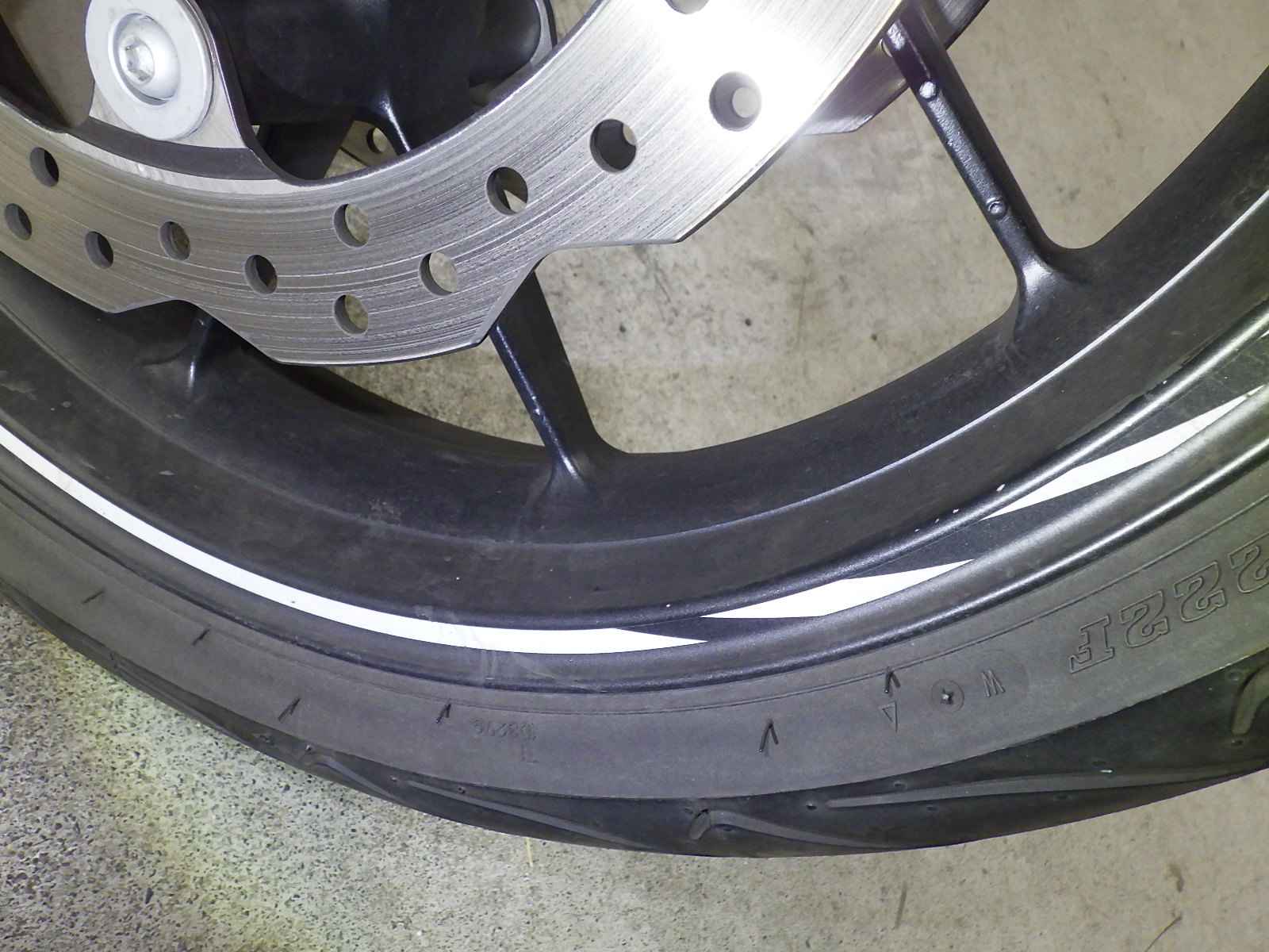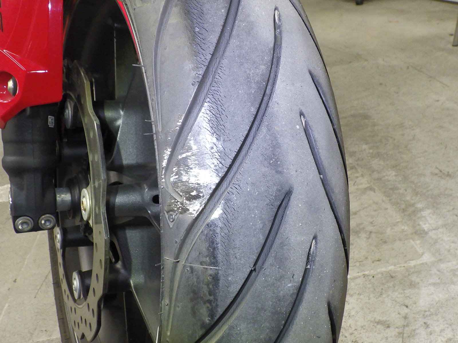 Передняя покрышка: Снижение давления в шине, Трещина требует замены.