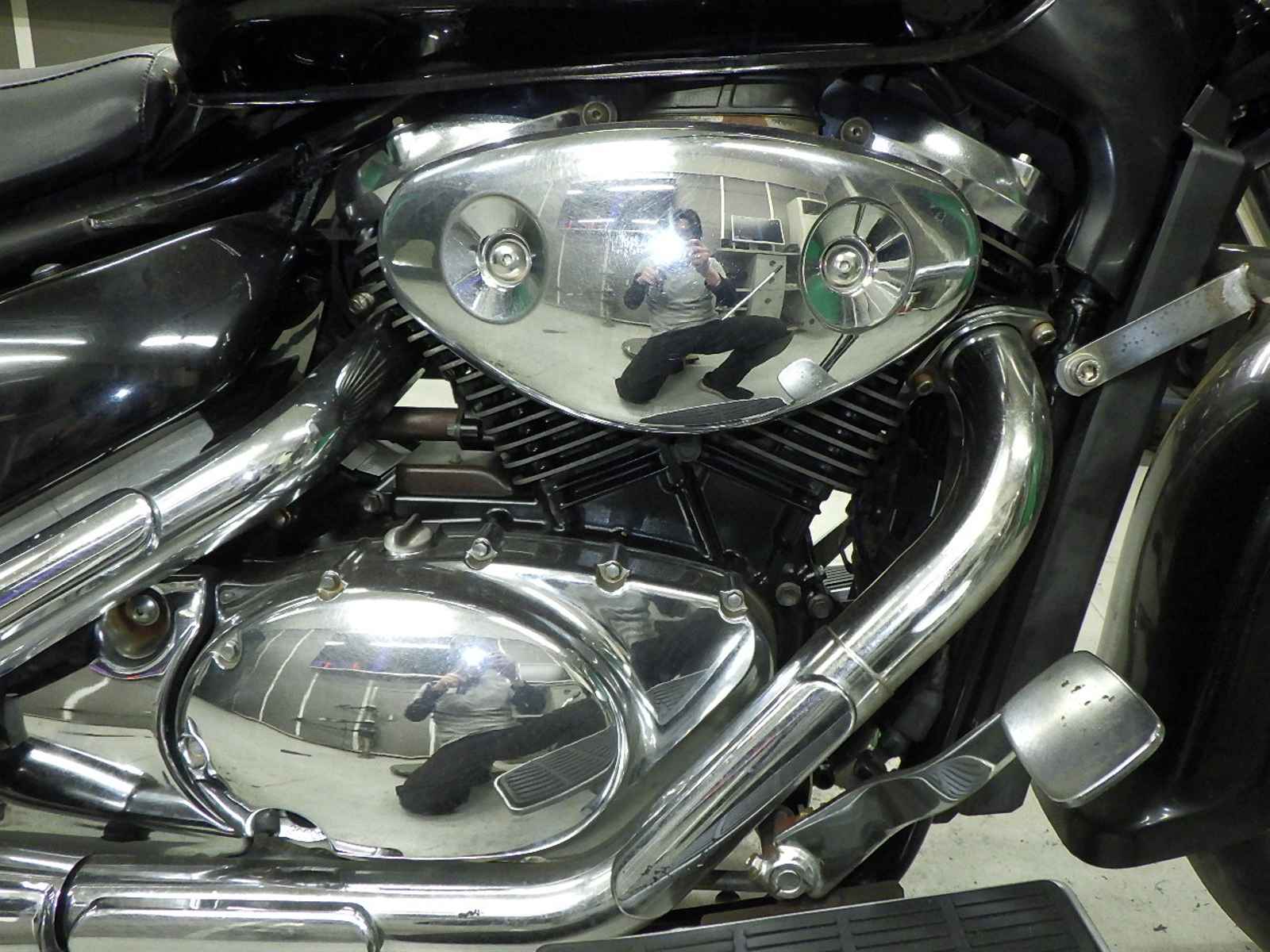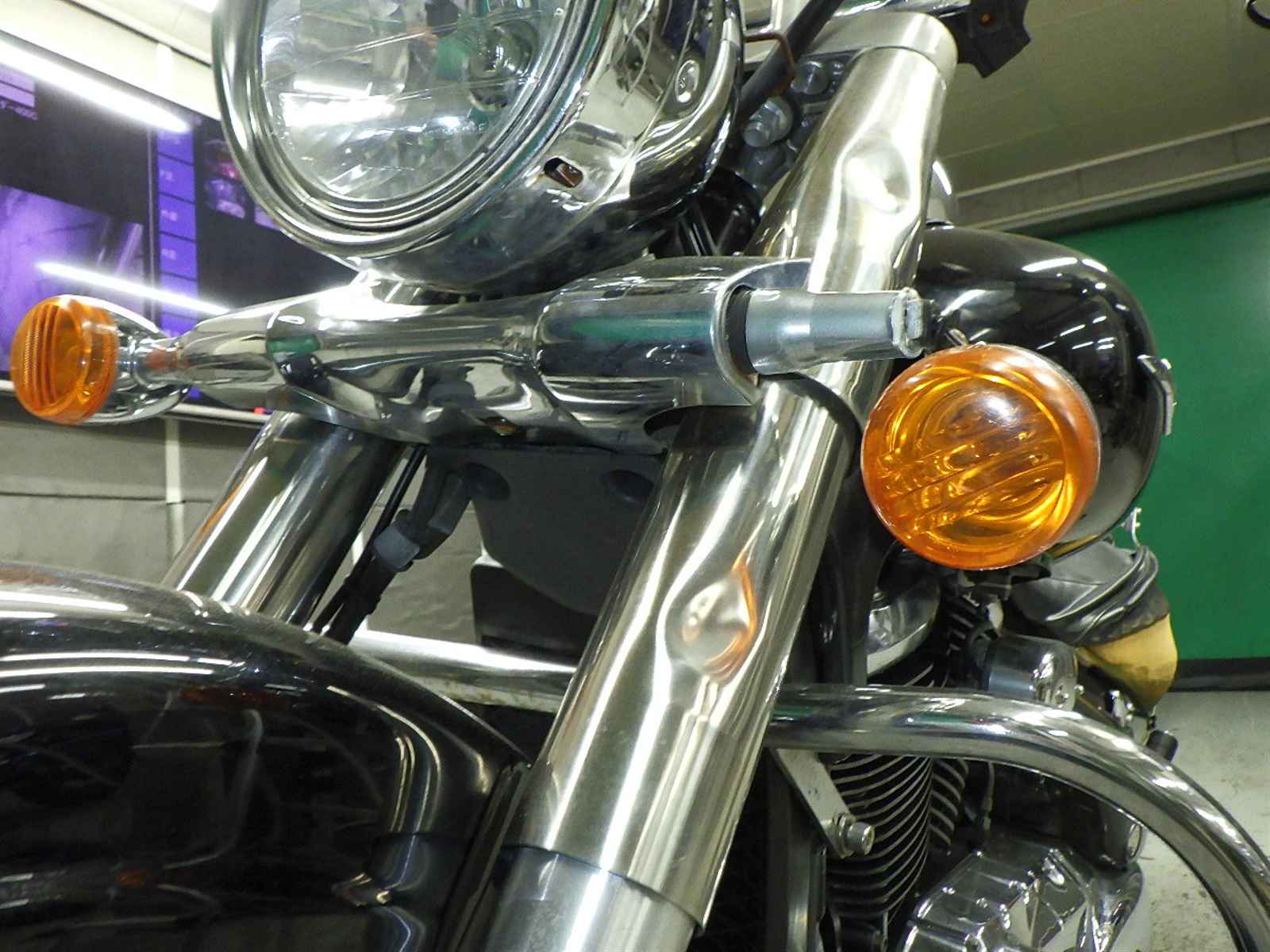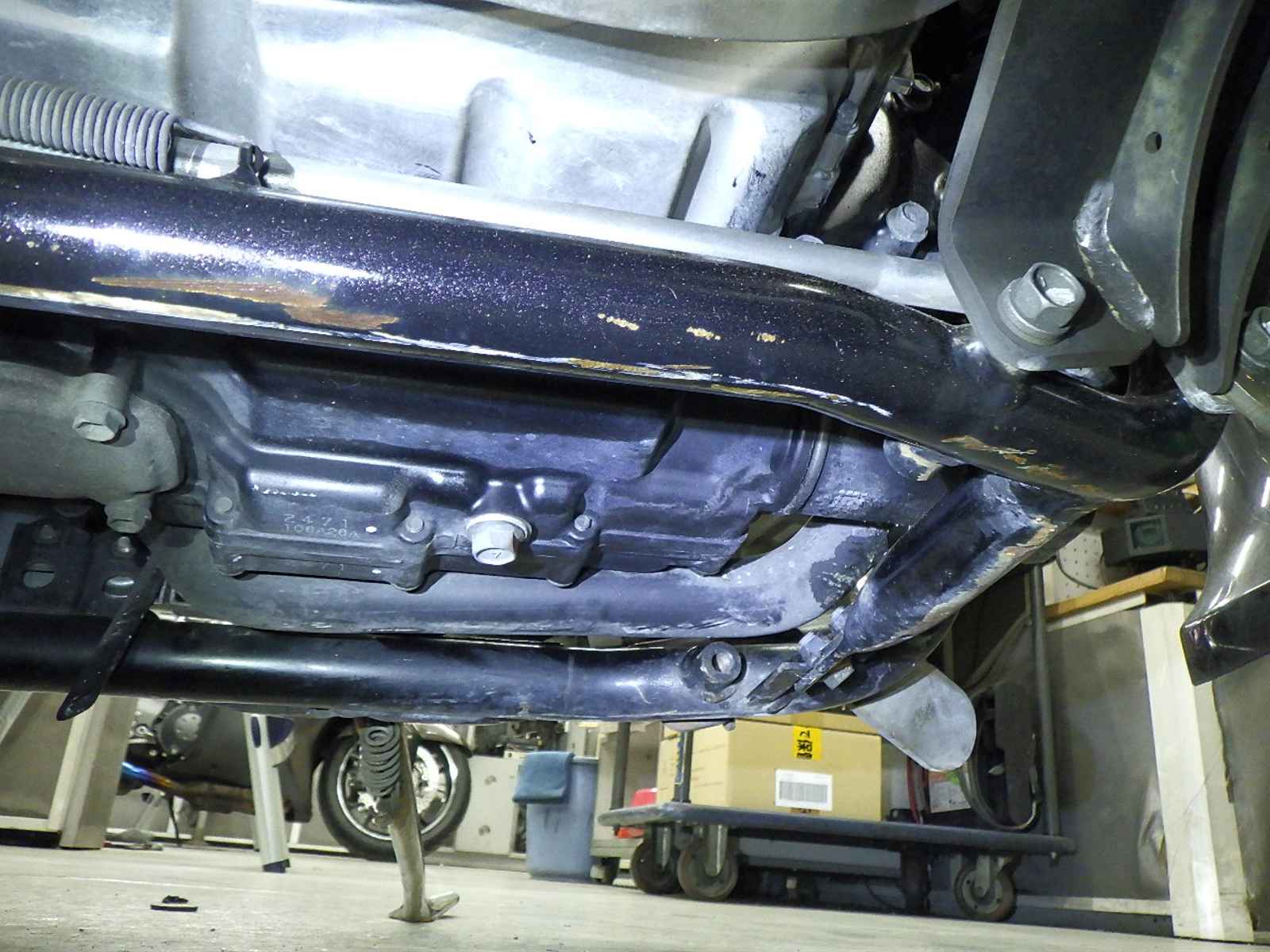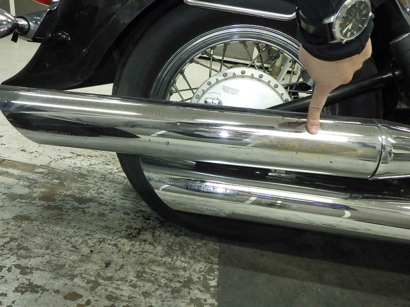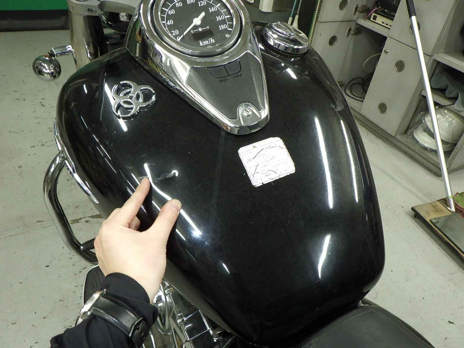 前足回りねじれ、曲がり大。全体キズ大、サビ多、変色。エンジンガード付きキズ大、凹み、サビ。