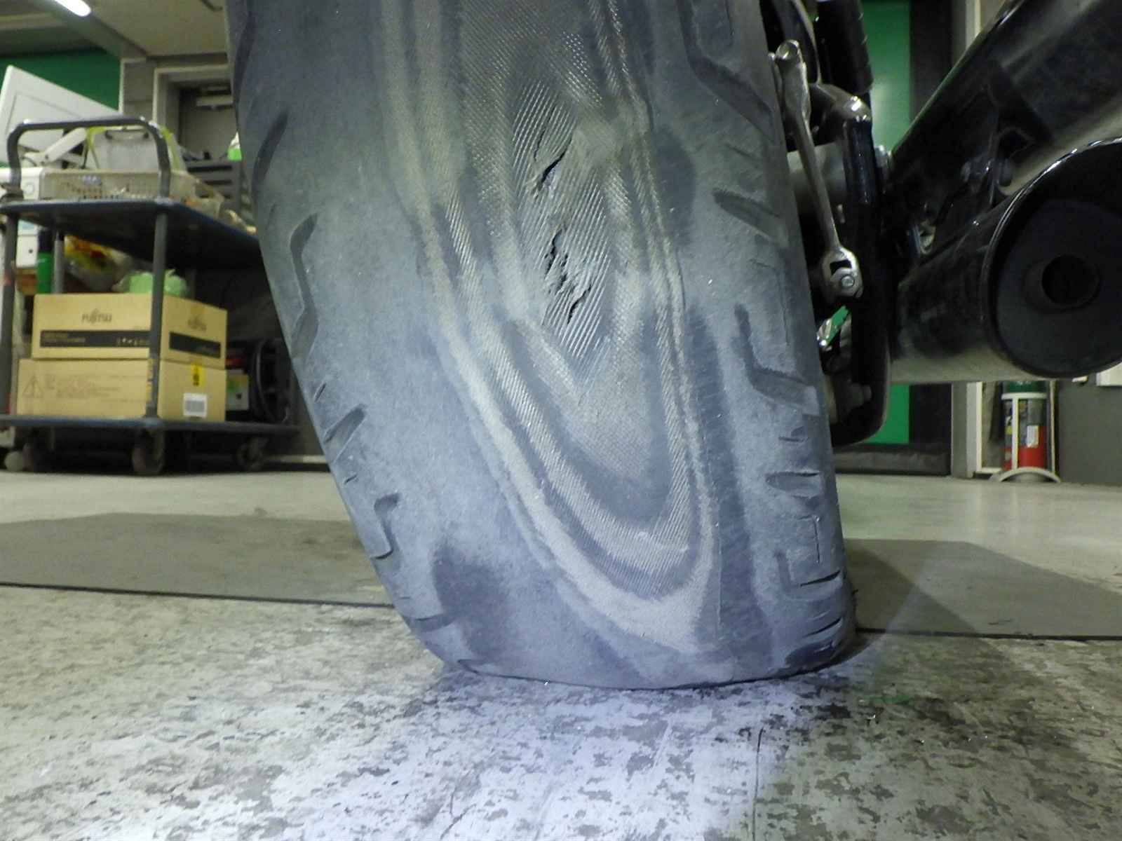Передняя покрышка: Снижение давления в шине, Трещина требует замены.