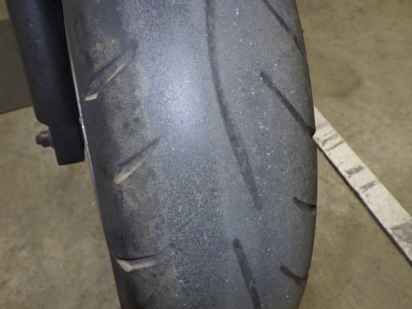 Передняя покрышка: Снижение давления в шине, Трещина требует замены.