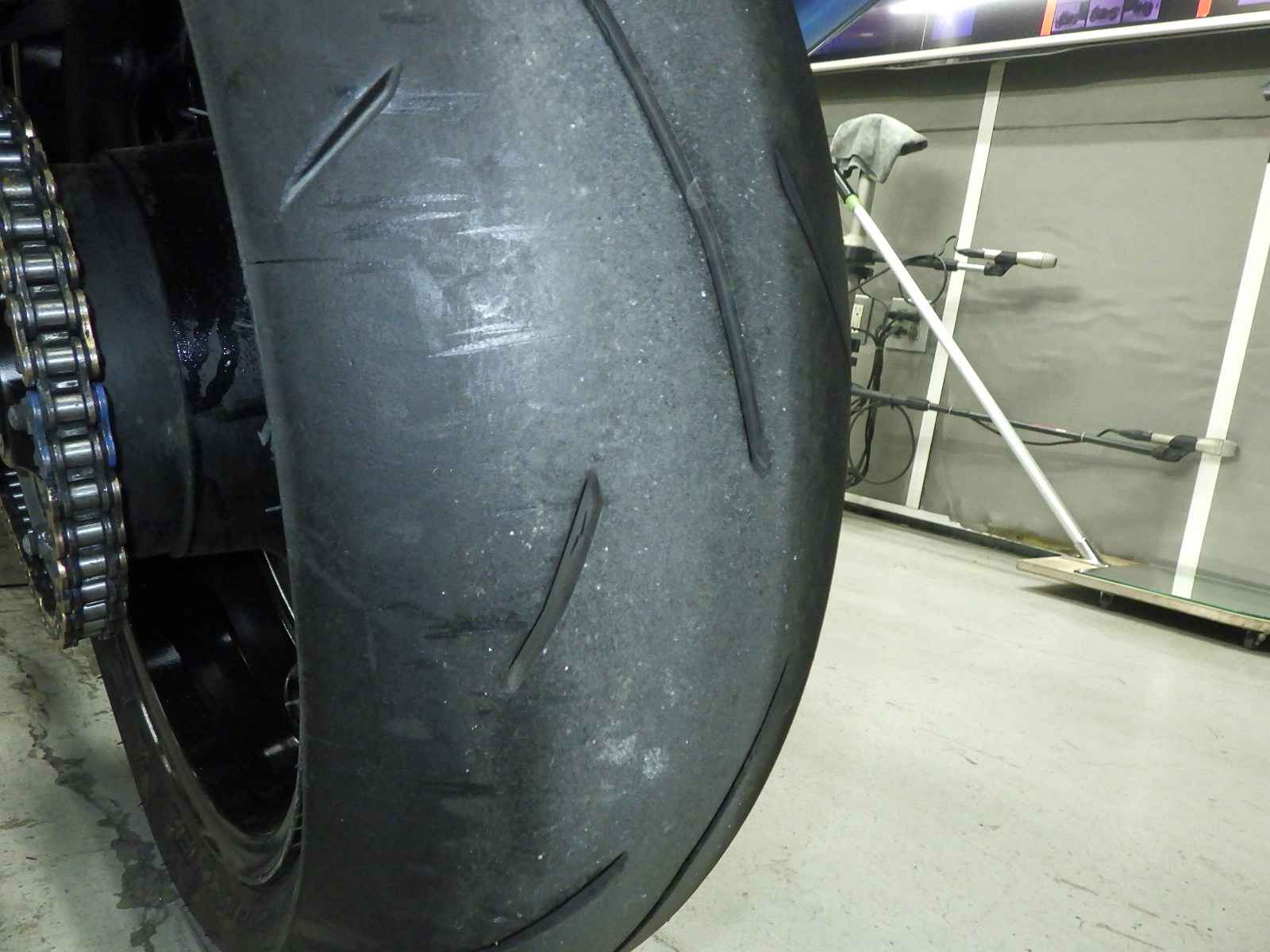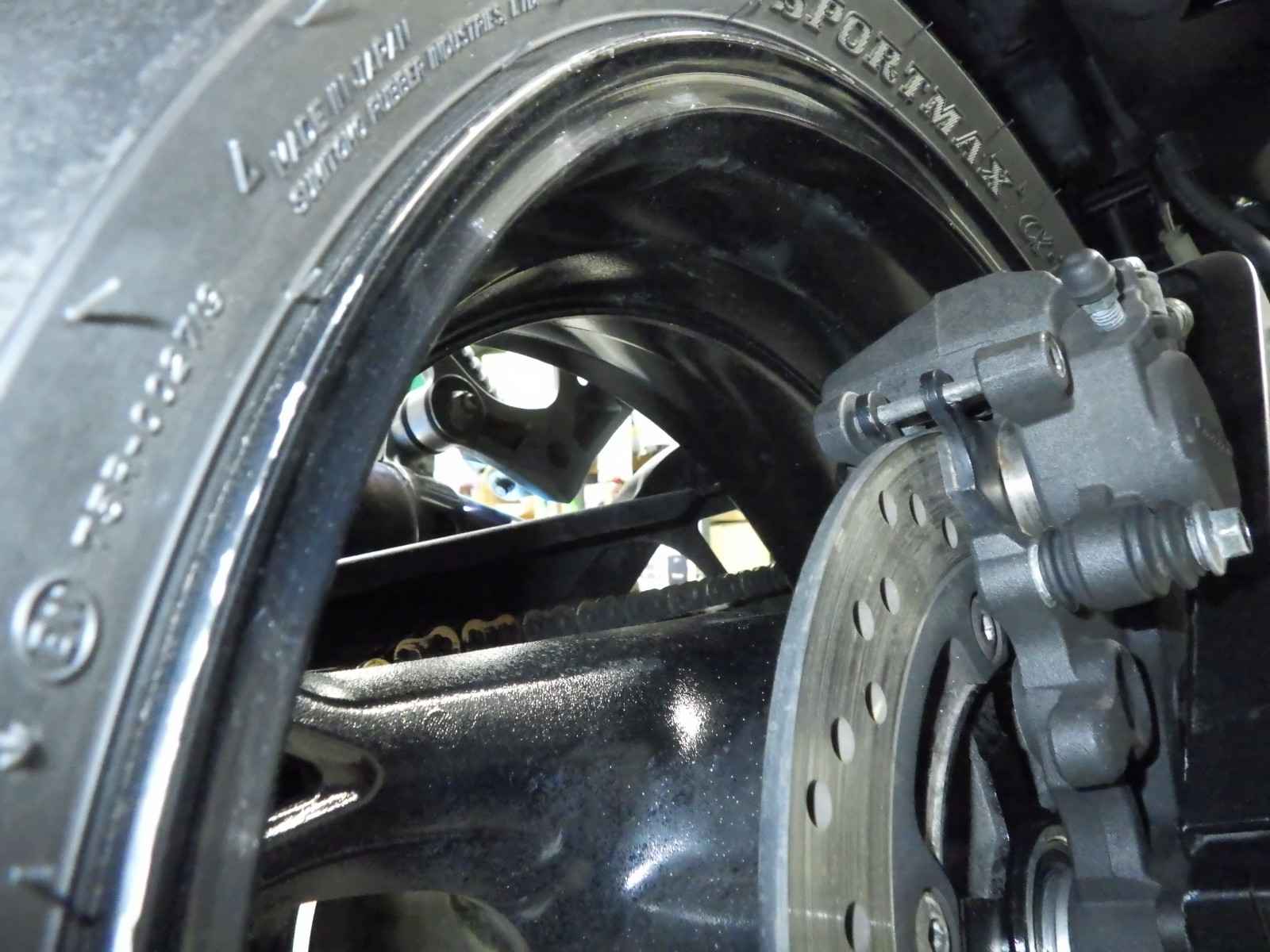 Задняя покрышка: Снижение давления в шине, Трещина требует замены.