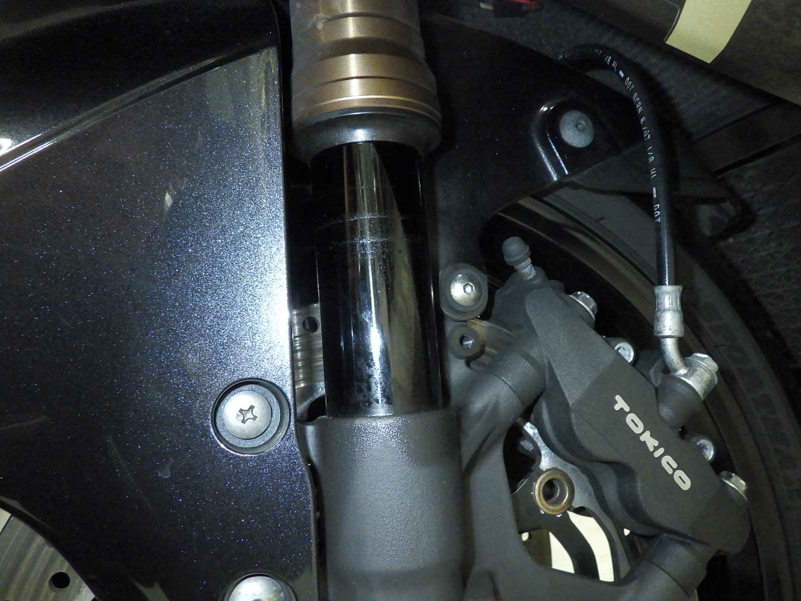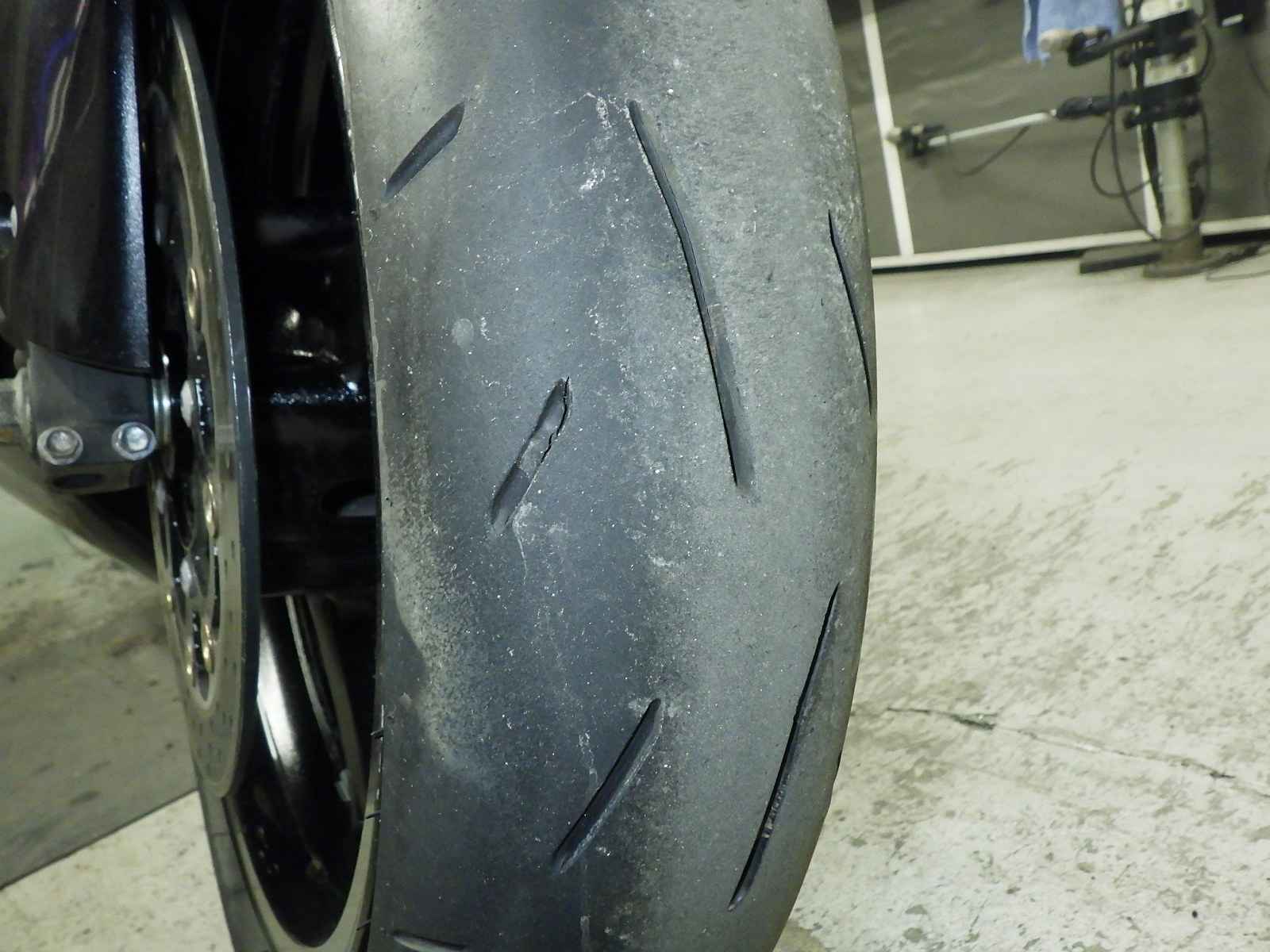 Передняя покрышка: Снижение давления в шине, Трещина требует замены.