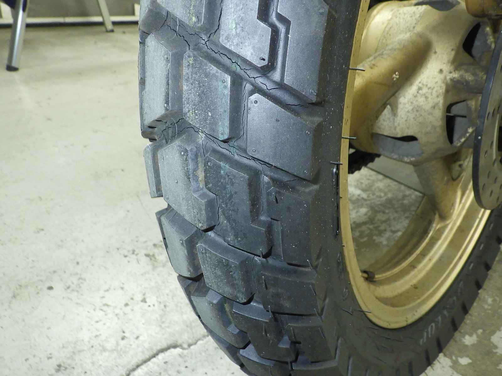 Задняя покрышка: Трещина на шине, требуется замена.