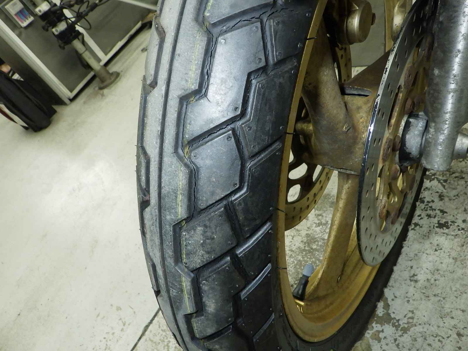 Передняя покрышка: Трещина на шине, требуется замена.