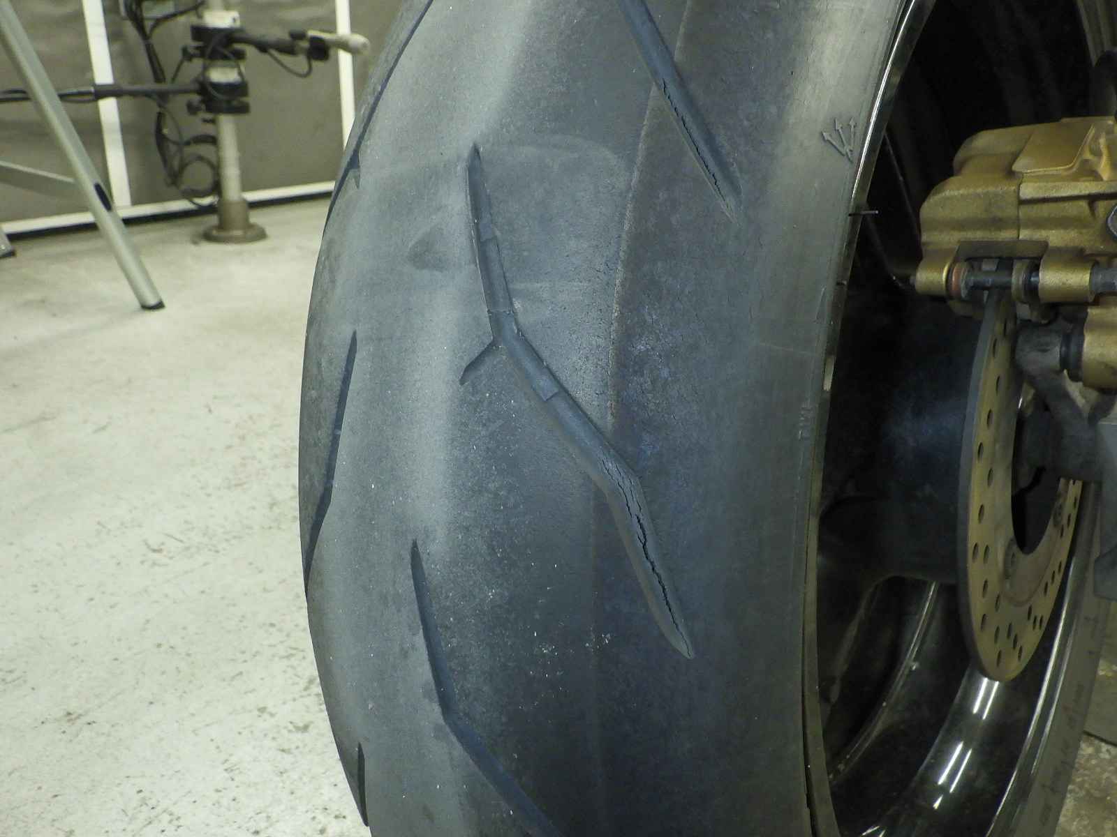 Задняя покрышка: Снижение давления в шине, Трещина требует замены.