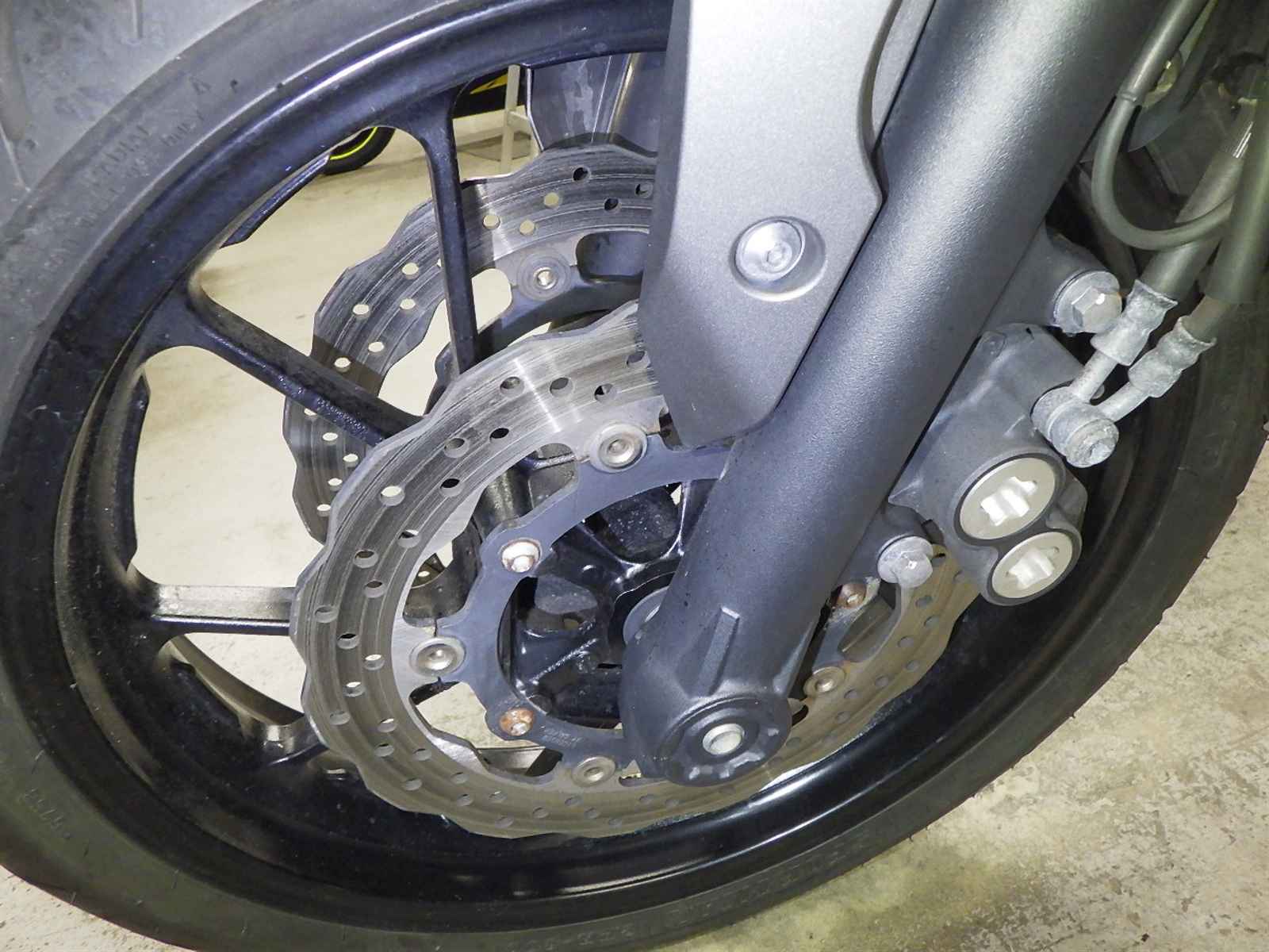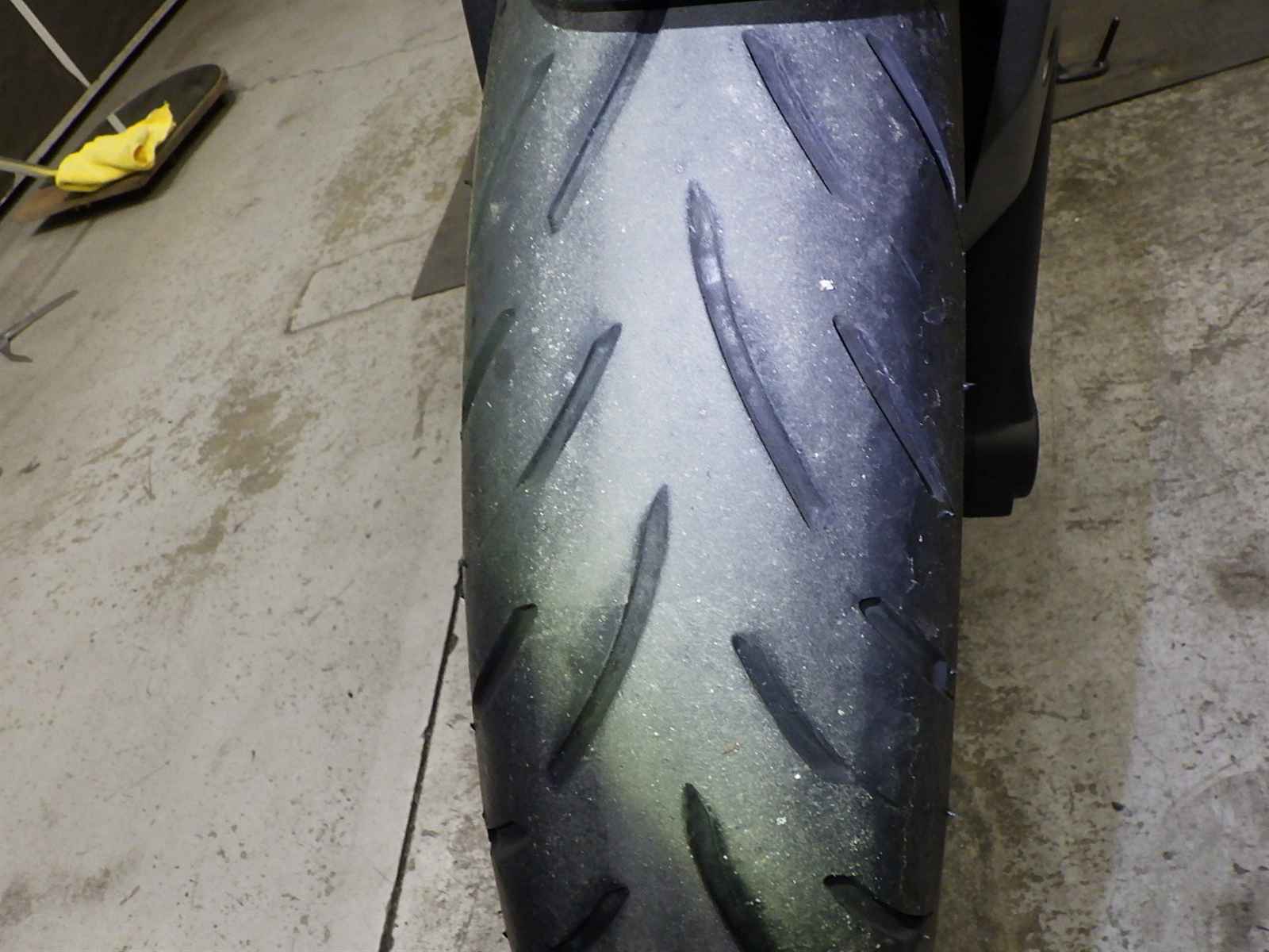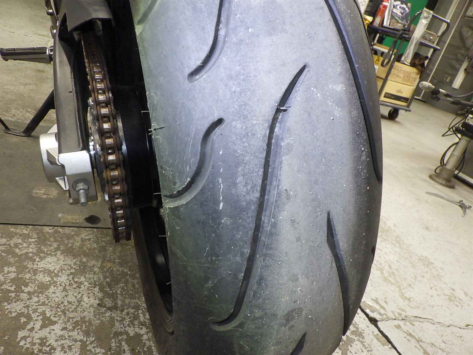Передняя покрышка: Снижение давления в шине, Трещина требует замены.