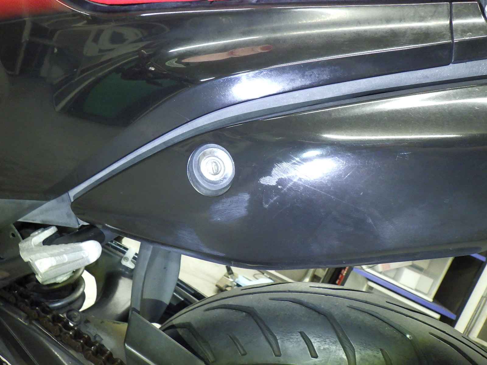 Задняя покрышка: Трещина на шине, требуется замена.