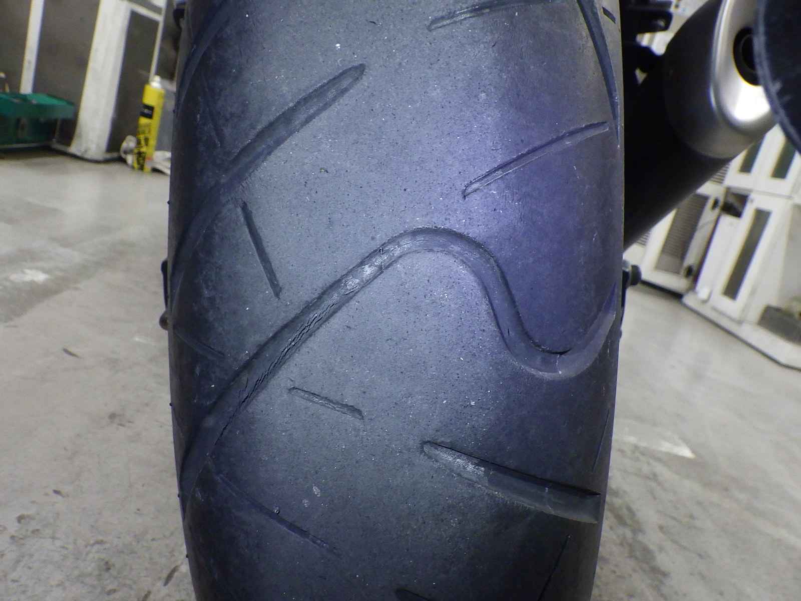 Задняя покрышка: Трещина на шине, требуется замена.