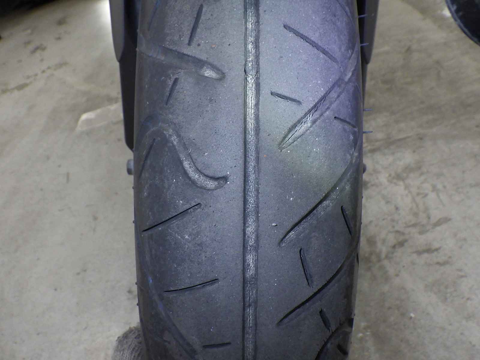 Передняя покрышка: Трещина на шине, требуется замена.