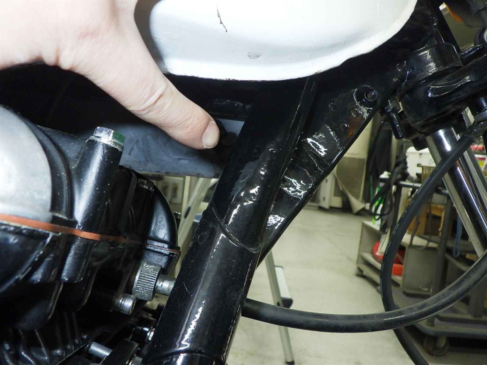Нижняя труба рамы: Недочет нижнего трубчатого элемента Уровень 3, Вмятина, Изгиб, Вся краска слезла, Трещина балки Уровень 3