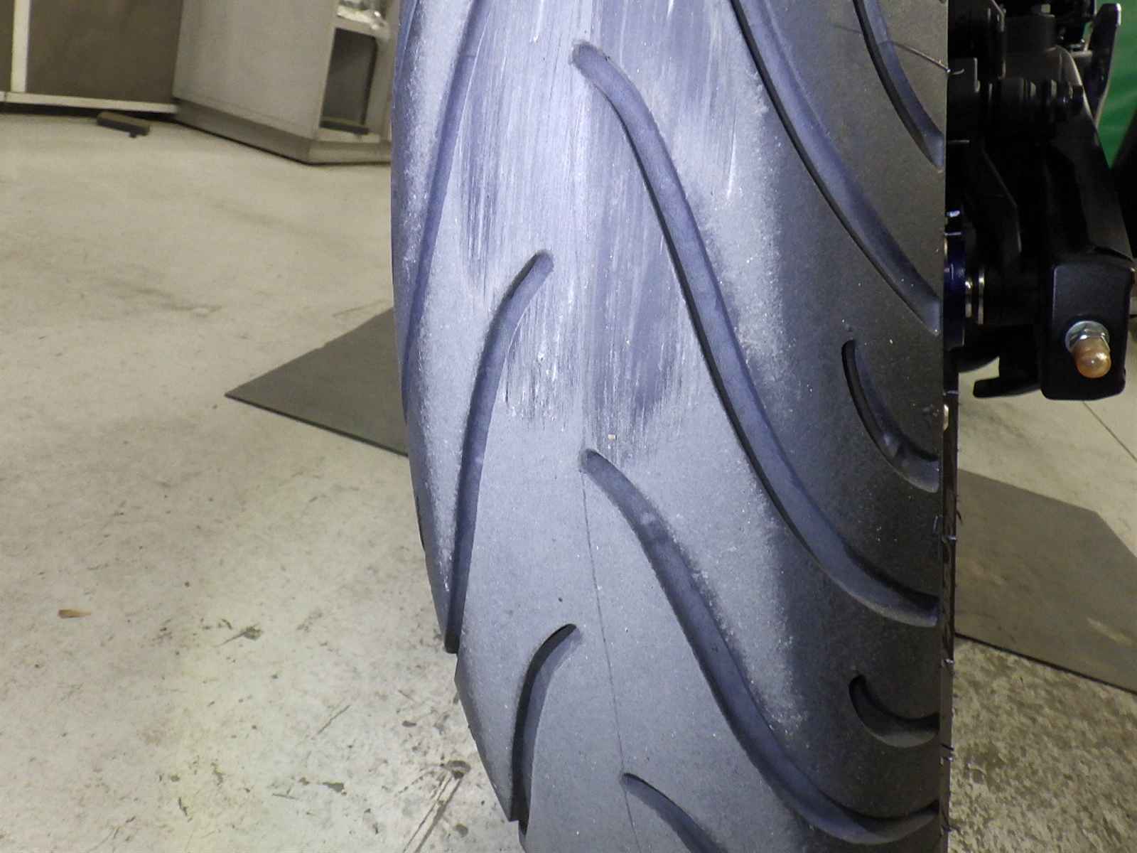 Передняя покрышка: Трещина на шине, требуется замена.