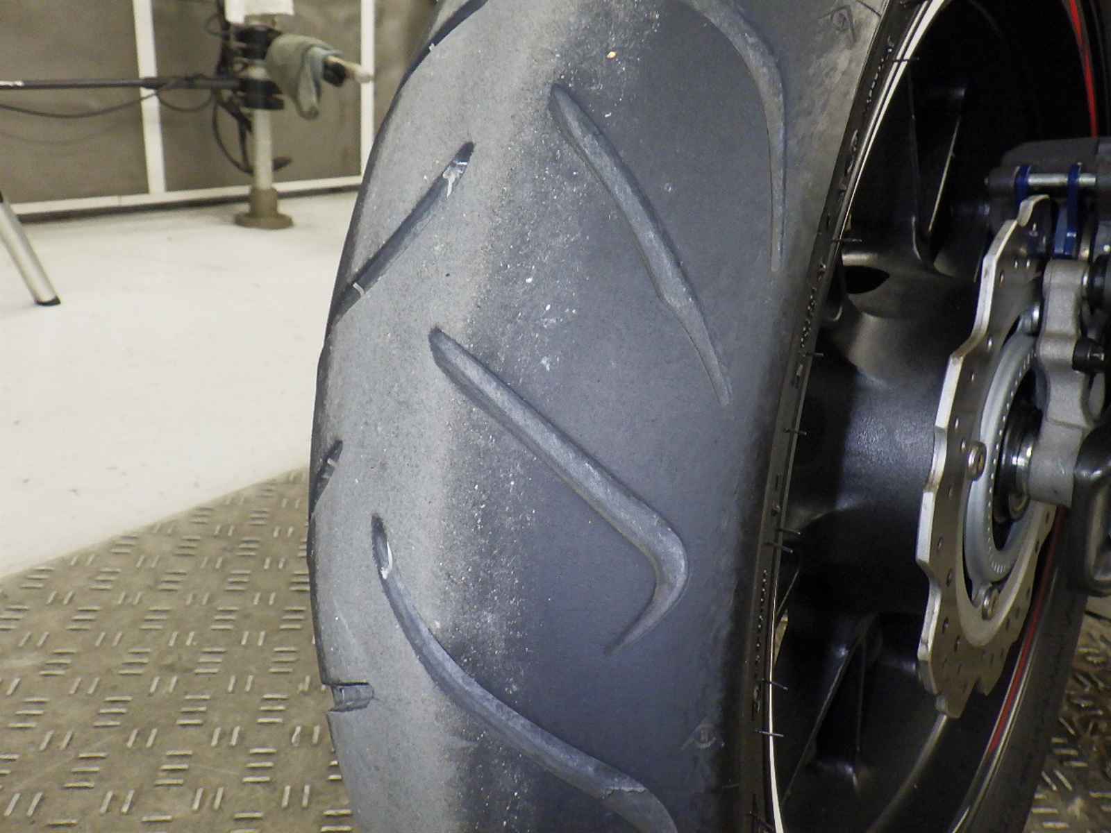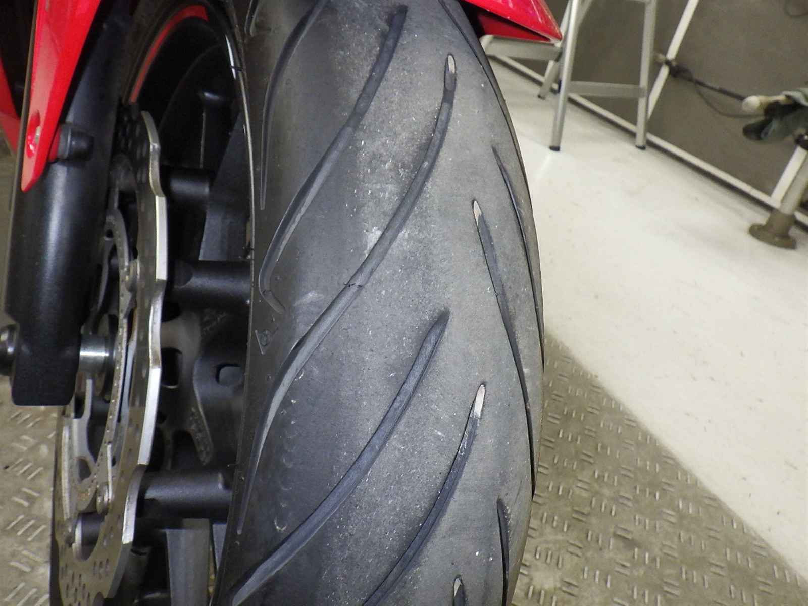 Передняя покрышка: Снижение давления в шине, Трещина требует замены.