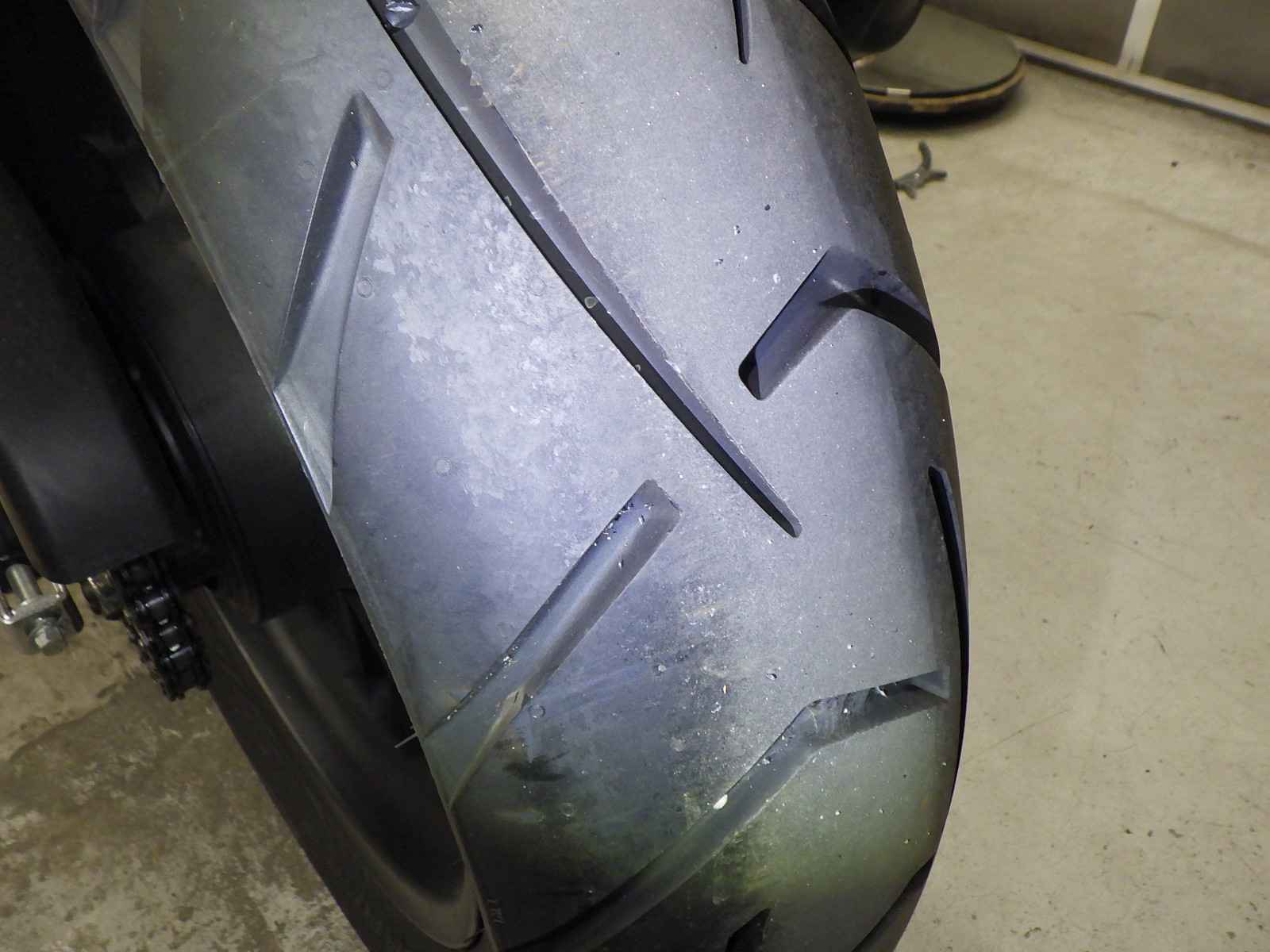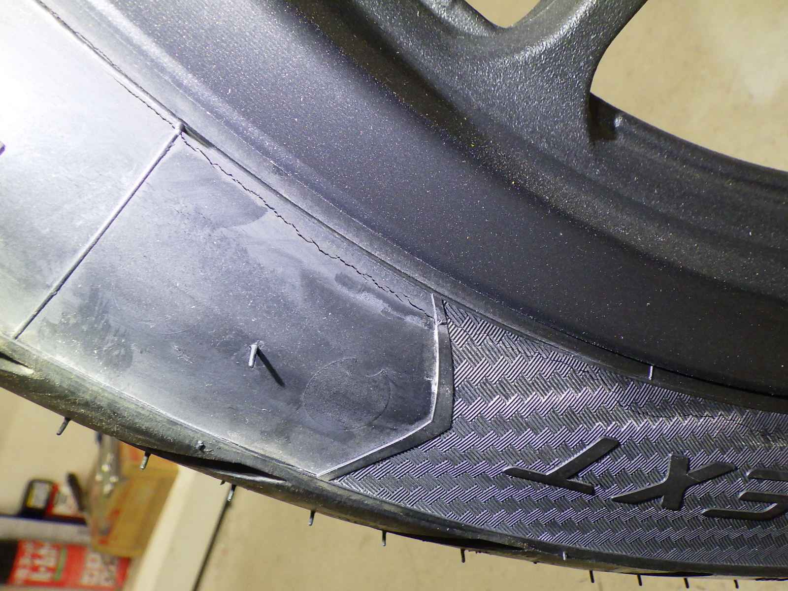 Передняя покрышка: Трещина на шине, требуется замена.