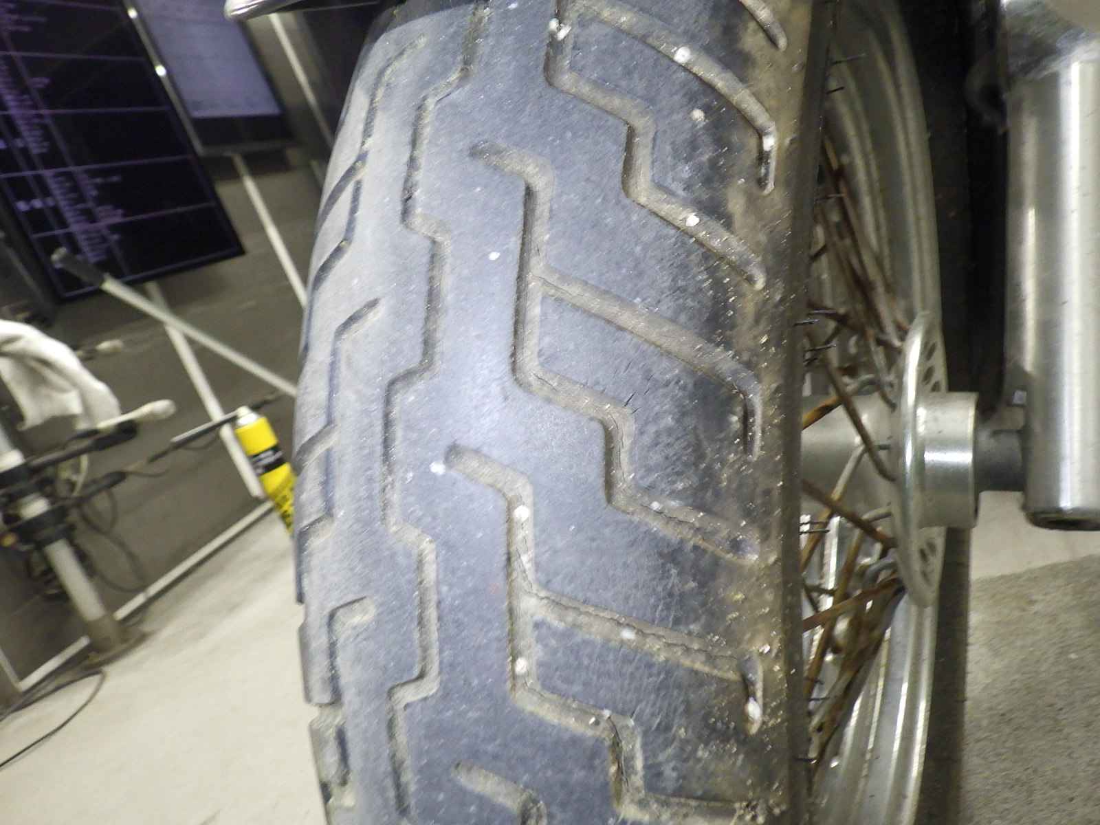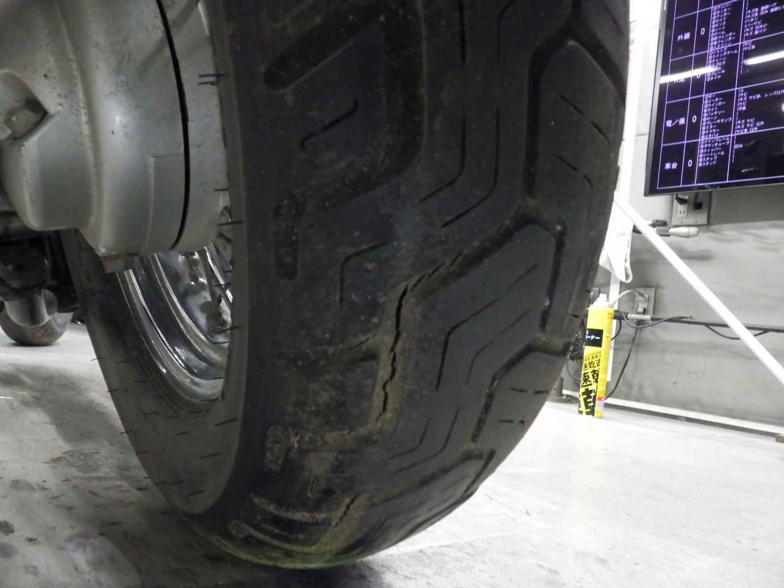 Передняя покрышка: Трещина на шине, требуется замена.
