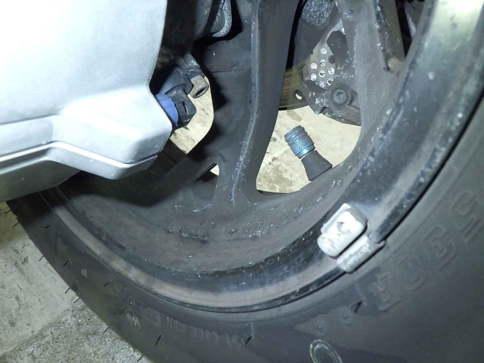 Передняя покрышка: Снижение давления в шине, Трещина требует замены.