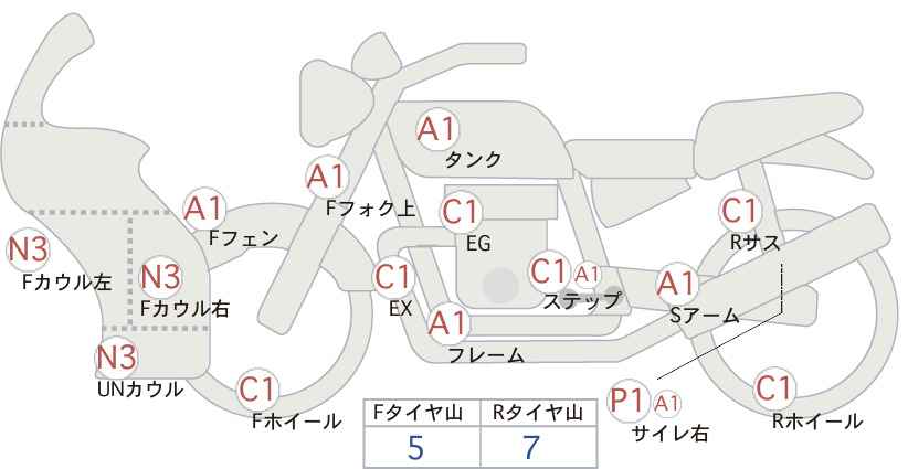 - Левый подножка имеет следы ремонта